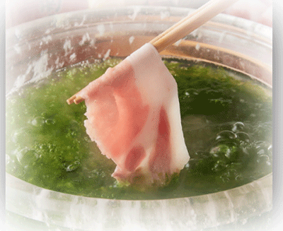 水晶の鍋にアオサがたくさん浮かんでて、そこにアグー豚🐷をしゃぶしゃぶ❤️めちゃくちゃ合うーたくさん食べたのにもう一皿追加