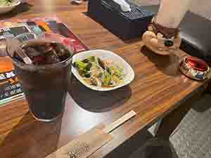 - はじめにサラダとセットの飲み物がすぐきます。野菜の種類も13種もありヘルシー美味しい😋