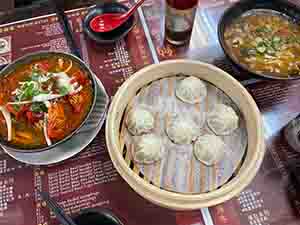セクシーな定員さんに惹かれて入ったお店で小籠包とガリガニの辛いスープ🌶と酸辣湯麺。どれもこれも美味しい😋